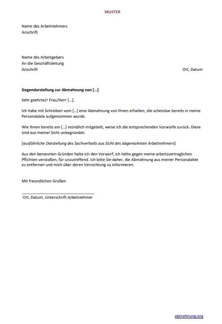Haben Arbeitnehmer eine Abmahnung mit Fehlern erhalten, sollten sie dies nicht auf sich beruhen lassen. Sie können einen Gegendarstellung gemäß § 83 Abs. 2 BetrVG verfassen und der Abmahnung widersprechen. Die Gegendarstellung wird dann der Personalakte hinzugefügt. Dies kann auch durch eine Klage vor dem Arbeitsgericht erreicht werden.